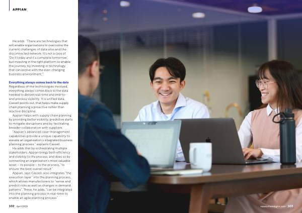 Appian , says Cassell , also integrates “ the execution layer ” into the planning process , which allows manufacturers to “ sense and predict risks as well as changes in demand patterns ”. These , he adds , “ can be integrated into the planning process in real-time to enable an agile planning process ”.