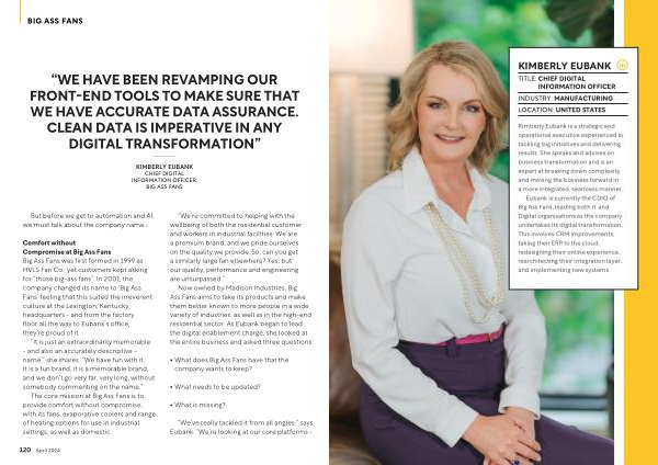 Eubank is currently the CDIO of Big Ass Fans , leading both IT and Digital organisations as the company undertakes its digital transformation . This involves CRM improvements , taking their ERP to the cloud , redesigning their online experience , rearchitecting their integration layer , and implementing new systems .