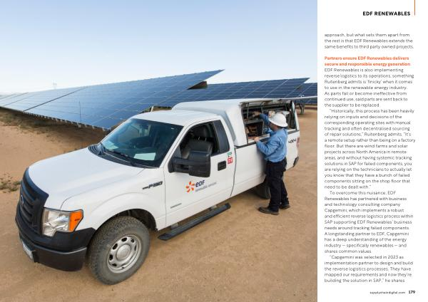 To overcome this nuisance , EDF Renewables has partnered with business and technology consulting company Capgemini , which implements a robust and efficient reverse logistics process within SAP supporting EDF Renewables ’ business needs around tracking failed components . A longstanding partner to EDF , Capgemini has a deep understanding of the energy industry — specifically renewables — and shares common values .