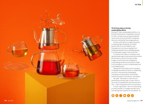 T2 ’ s B Corp status is driving sustainability efforts Driving T2 Tea ’ s sustainability efforts is its B Corp Certification . A landmark moment for the company was joining the global community of around 3,000 companies who are certified B Corp organisations .