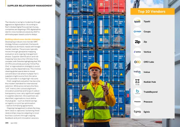 Building robust cross-border strategies Developing a robust cross-border SRM strategy follows a systematic framework that balances domestic needs with foreign market realities. The process typically moves through geospatial mapping, evaluation and ongoing management phases. Supplier identification and risk mapping have become infinitely more complex, with Deloitte highlighting that 76 % of CPOs are actively pursuing“ China Plus One” or regionalisation strategies to avoid single-country dependencies. This involves cleaning global spend data to reveal concentration risk where multiple Tier-1 suppliers might source from the same Tier-2 provider in a single high-risk zone.