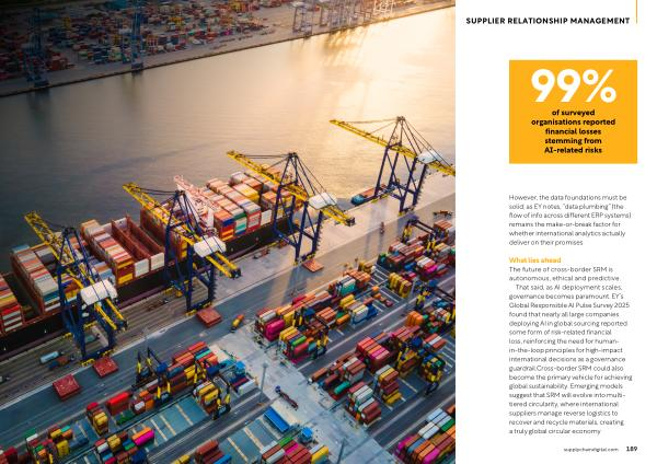 That said, as AI deployment scales, governance becomes paramount. EY’ s Global Responsible AI Pulse Survey 2025 found that nearly all large companies deploying AI in global sourcing reported some form of risk-related financial loss, reinforcing the need for humanin-the-loop principles for high-impact international decisions as a governance guardrail. Cross-border SRM could also become the primary vehicle for achieving global sustainability. Emerging models suggest that SRM will evolve into multitiered circularity, where international suppliers manage reverse logistics to recover and recycle materials, creating a truly global circular economy.