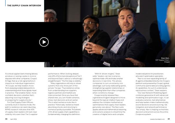 If a critical supplier starts missing delivery windows or seeing a spike in invoice disputes with other companies, Coupa’ s AI flags that as a risk signal before it impacts an individual organisation.“ At Coupa, we help leaders move from analysing isolated data points to understanding what those signals mean in practice. That enables faster, more confident decisions; whether that’ s adjusting sourcing strategies or preparing for supply shocks.”