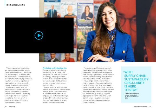 “ Large Language Models can extend these capabilities by analysing complex datasets such as geospatial and satellite data, helping organisations model physical climate risks like flooding, heat stress or extreme weather events,” he explains.“ Over longer time horizons, these insights support infrastructure planning, energy efficiency and long-term supply chain resilience. AI significantly improves how organisations detect, understand and respond to climate-related supply chain risk. By continually analysing supplier, logistic and environmental data, AI can identify where disruption is likely to occur and trigger preventative action in near real time.
