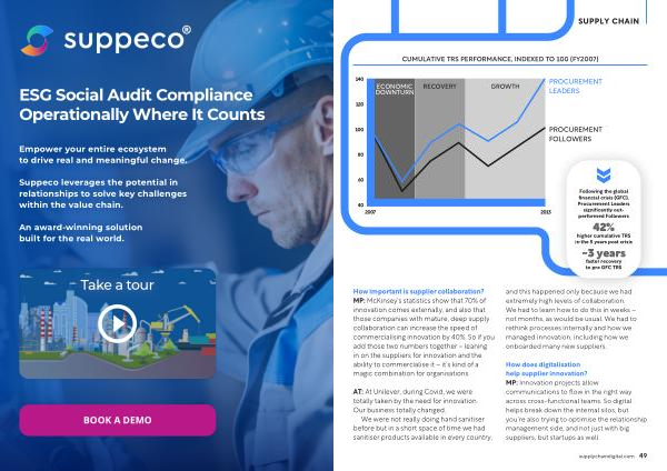How important is supplier collaboration ? MP : McKinsey ’ s statistics show that 70 % of innovation comes externally , and also that those companies with mature , deep supply collaboration can increase the speed of commercialising innovation by 40 %. So if you add those two numbers together – leaning in on the suppliers for innovation and the ability to commercialise it – it ’ s kind of a magic combination for organisations .