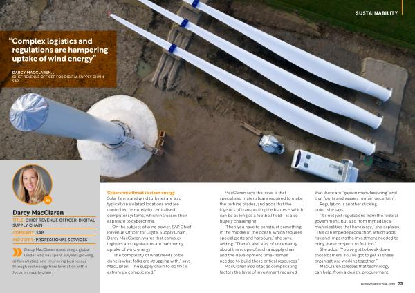 On the subject of wind power , SAP Chief Revenue Officer for Digital Supply Chain , Darcy MacClaren , warns that complex logistics and regulations are hampering uptake of wind energy .
