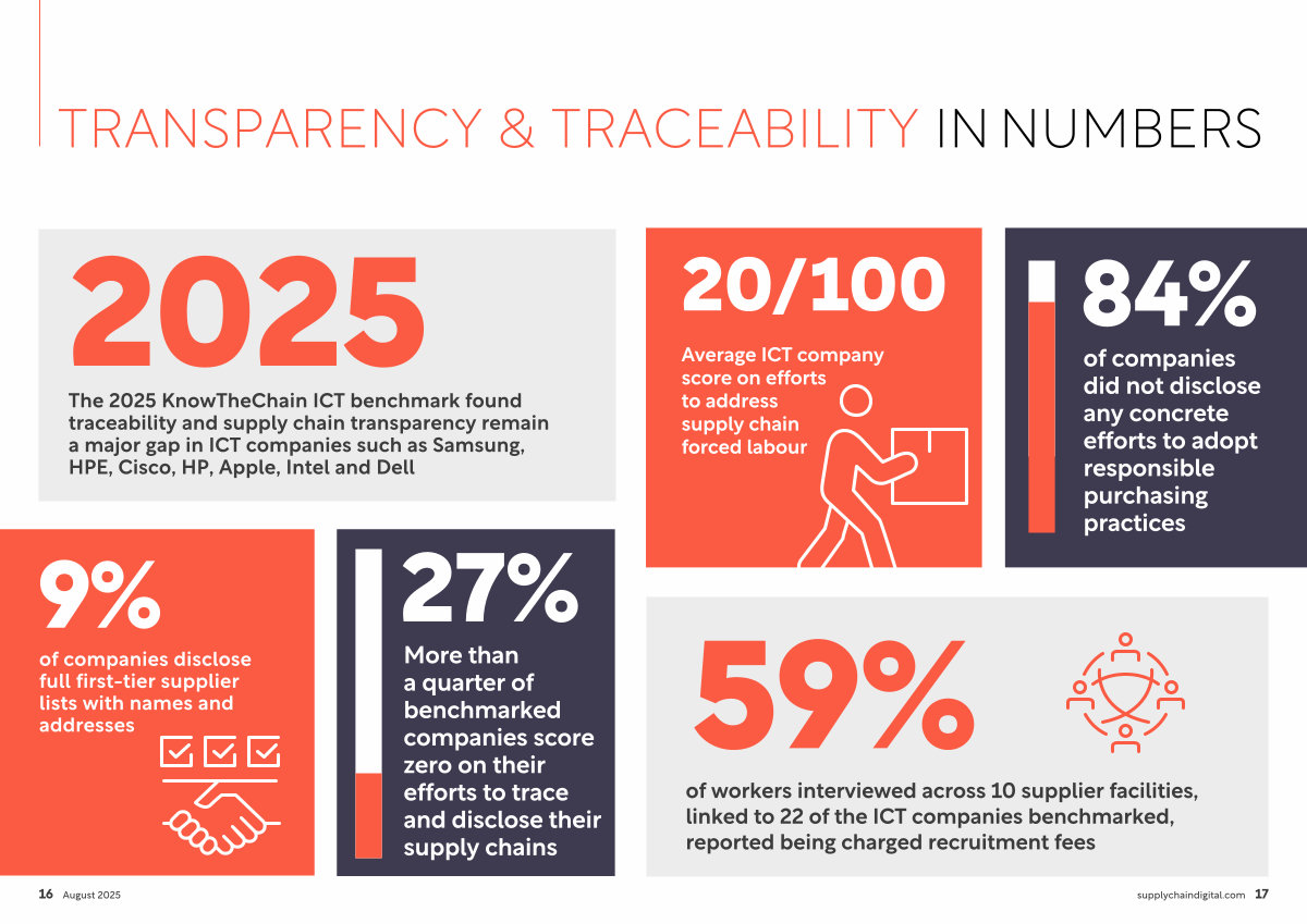 The 2025 KnowTheChain ICT benchmark found traceability and supply chain transparency remain a major gap in ICT companies such as Samsung, HPE, Cisco, HP, Apple, Intel and Dell
