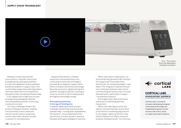 Wetware computing interlinks neuroscience, computer science and bioengineering, opening possibilities for real-time adaptation and accelerated predictive analytics in supply chains. This could enable supply chain planning systems that react faster and more resiliently to disruptions than rule-based software today.