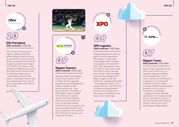 US global shipping and contract logistics services organisation XPO Logistics is responsible for the supply chains of almost three-quarters of Fortune 100 firms . XPO ’ s headquarters are in Connecticut , and it boasts 1,530 sites in 30 countries . Specialty areas include : freight brokerage ; intermodal and drayage ( shortdistance logistics ); last-mile distribution ; and global forwarding . KN Integrated Logistics is its supply chain arm , with the areas it handles including supplier and inventory management , aftermarket management , and supply chain technology .