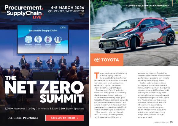 Dealers and distributors join in through the Environmental Global Policy, which keeps more than 15,000 sites on the same CO2 pathway. Add in transport partners using loweremission trailer formats and material suppliers working on recycled inputs and Toyota ends up with a supply chain that moves in one direction. At board level, sustainability committees monitor progress so the whole network can evolve with the same rhythm and keep Scope 3 emissions on a steady downward track. supplychaindigital. com 131