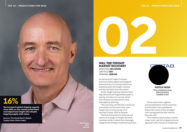 “ The economy will feel like a recession and a boom at the same time, and freight will sit at the center of it,” says Neil Cawse, CEO of Geotab.