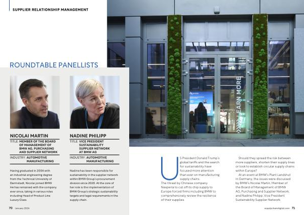 Nadine has been responsible for sustainability in the supplier network within BMW Group’ s procurement division since 2020. At the core of her role is the implementation of BMW Group’ s strategic sustainability targets and legal requirements in the supply chain.