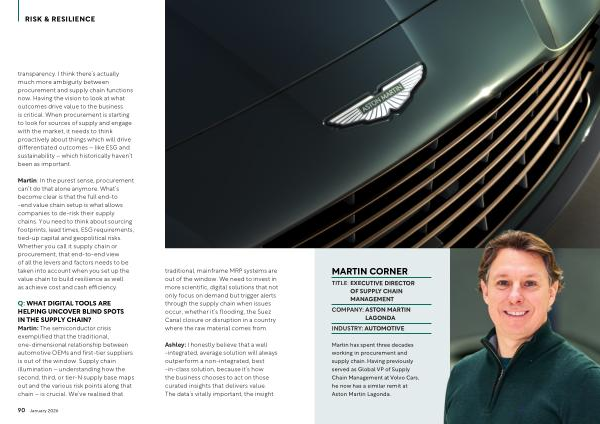 Q: WHAT DIGITAL TOOLS ARE HELPING UNCOVER BLIND SPOTS IN THE SUPPLY CHAIN? Martin: The semiconductor crisis exemplified that the traditional, one-dimensional relationship between automotive OEMs and first-tier suppliers is out of the window. Supply chain illumination – understanding how the second, third, or tier-N supply base maps out and the various risk points along that chain – is crucial. We’ ve realised that traditional, mainframe MRP systems are out of the window. We need to invest in more scientific, digital solutions that not only focus on demand but trigger alerts through the supply chain when issues occur, whether it’ s flooding, the Suez Canal closure or disruption in a country where the raw material comes from.