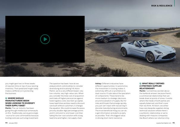The question has been: how do we analyse which commodities to consider diversifying and localising? At Aston Martin, we’ re a very different beast: very low-volume, very high-value cars. When you consider the total cost of acquisition and trade off higher piece prices against lower logistics costs, less tied-up capital, lower lead times and less need to discount cars built without customers, it changes the equation. We could increase the piece price by double-digit percentage points and it’ s still end-to-end lower cost than taking the low-cost solution with a long lead time and higher-risk supply chain.