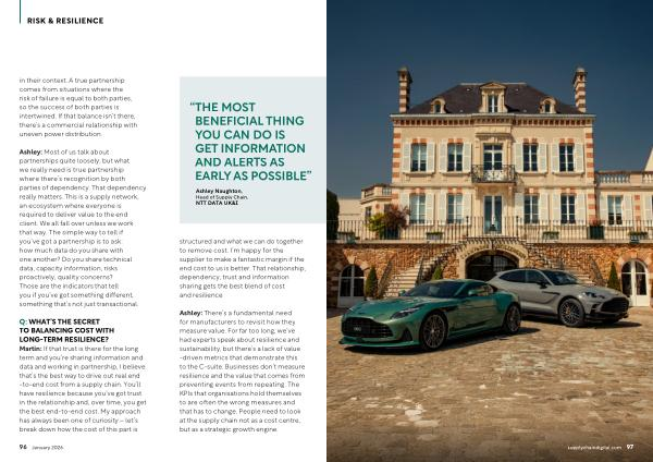 Ashley: There’ s a fundamental need for manufacturers to revisit how they measure value. For far too long, we’ ve had experts speak about resilience and sustainability, but there’ s a lack of value-driven metrics that demonstrate this to the C-suite. Businesses don’ t measure resilience and the value that comes from preventing events from repeating. The KPIs that organisations hold themselves to are often the wrong measures and that has to change. People need to look at the supply chain not as a cost centre, but as a strategic growth engine.