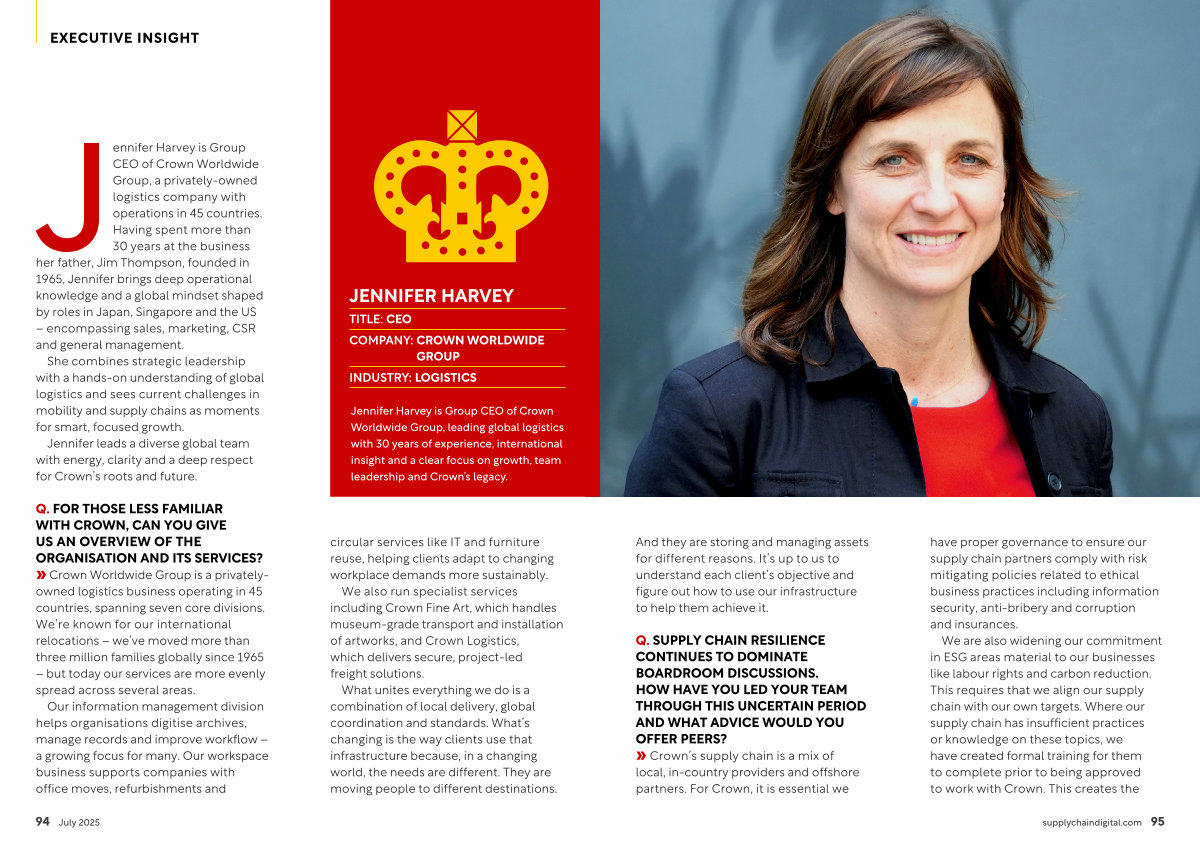 Jennifer Harvey is Group CEO of Crown Worldwide Group, leading global logistics with 30 years of experience, international insight and a clear focus on growth, team leadership and Crown’ s legacy.