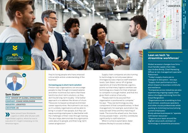 Supply chain companies are also turning to technology to not only ease labour shortages but also improve staff retention levels . Sam Slater , senior VP of global operations at Crane Worldwide Logistics , points out that many logistics workers see technology as a means for their employer to compete in a tough market , and that this gives them a sense of security .
