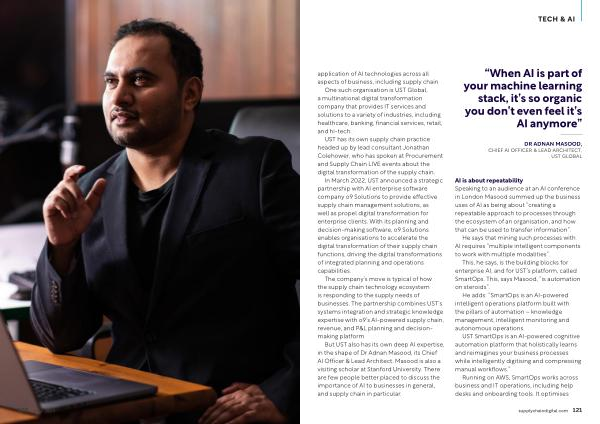 But UST also has its own deep AI expertise , in the shape of Dr Adnan Masood , its Chief AI Officer & Lead Architect . Masood is also a visiting scholar at Stanford University . There are few people better placed to discuss the importance of AI to businesses in general , and supply chain in particular .