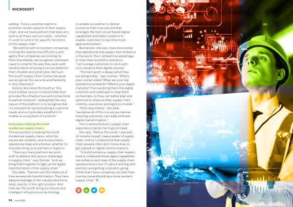 “ To build resilience , supply chain leaders have to understand how digital capabilities can enhance each step of the supply chain operational process . It ’ s about working with partners and getting a dynamic going . I think that ’ s how companies can start their journey toward building a more resilient supply chain .” 94 June 2023