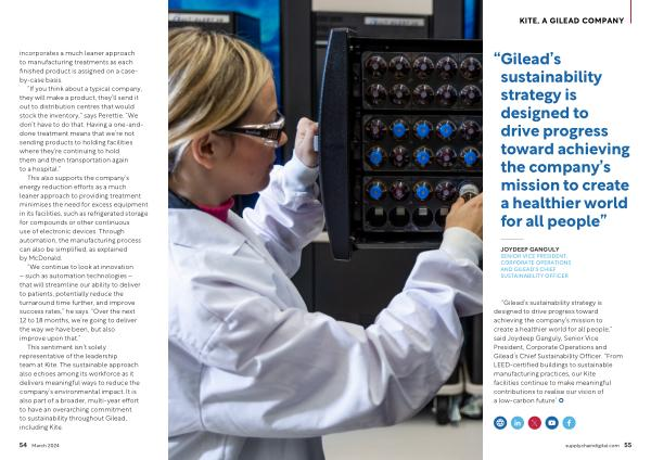 This sentiment isn ’ t solely representative of the leadership team at Kite . The sustainable approach also echoes among its workforce as it delivers meaningful ways to reduce the company ’ s environmental impact . It is also part of a broader , multi-year effort to have an overarching commitment to sustainability throughout Gilead , including Kite .
