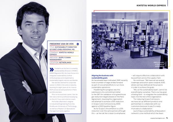 Sustainability Director of KWE ’ s EMEA Regional HQ . His main focus is to integrate sustainability further in the business and implement a sustainable logistic service worldwide .