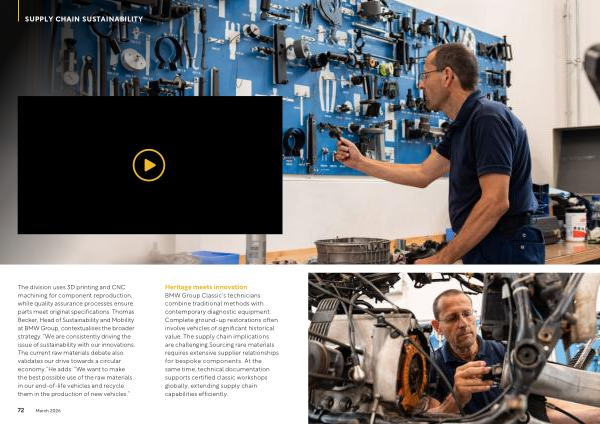 SUPPLY CHAIN SUSTAINABILITY The division uses 3D printing and CNC machining for component reproduction, while quality assurance processes ensure parts meet original specifications. Thomas Becker, Head of Sustainability and Mobility at BMW Group, contextualises the broader strategy.“ We are consistently driving the issue of sustainability with our innovations. The current raw materials debate also validates our drive towards a circular economy.” He adds:“ We want to make the best possible use of the raw materials in our end-of-life vehicles and recycle them in the production of new vehicles.”