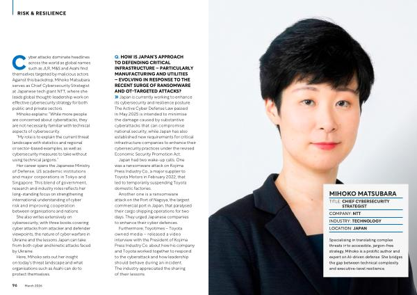 Cyber attacks dominate headlines across the world as global names such as JLR, M & S and Asahi find themselves targeted by malicious actors. Against this backdrop, Mihoko Matsubara serves as Chief Cybersecurity Strategist at Japanese tech giant NTT, where she leads global thought-leadership work on effective cybersecurity strategy for both public and private sectors.
