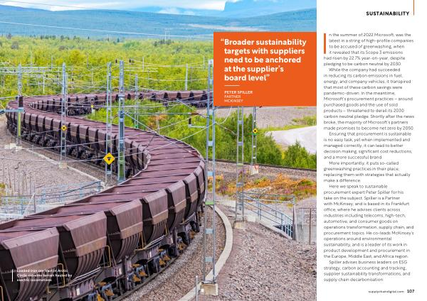 Here we speak to sustainable procurement expert Peter Spiller for his take on the subject . Spiller is a Partner with McKinsey , and is based in its Frankfurt office , where he advises clients across industries including telecoms , high-tech , automotive , and consumer goods on operations transformation , supply chain , and procurement topics . He co-leads McKinsey ’ s operations around environmental sustainability , and is a leader of its work in product development and procurement in the Europe , Middle East , and Africa region .