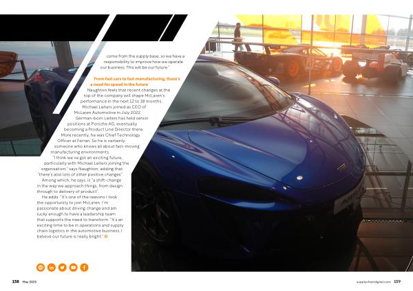 He adds : “ It ’ s one of the reasons I took the opportunity to join McLaren . I ’ m passionate about driving change and am lucky enough to have a leadership team that supports the need to transform . “ It ’ s an exciting time to be in operations and supply chain logistics in the automotive business . I believe our future is really bright .” 158 May 2023