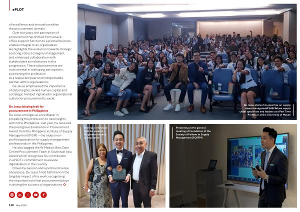 De Jesus blazing trail for procurement in Philippines De Jesus emerges as a trailblazer in propelling the profession to new heights within the Philippines . Last year , he received the prestigious Excellence in Procurement Award from the Philippine Institute of Supply Management ( PISM ) – the oldest nonprofit organisation for supply management professionals in the Philippines .