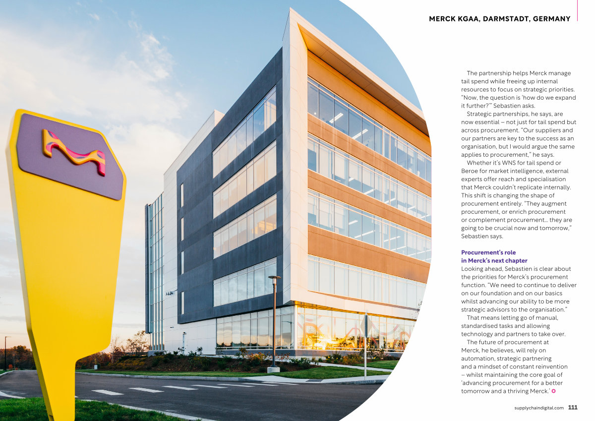 Procurement’ s role in Merck’ s next chapter Looking ahead, Sebastien is clear about the priorities for Merck’ s procurement function.“ We need to continue to deliver on our foundation and on our basics whilst advancing our ability to be more strategic advisors to the organisation.”