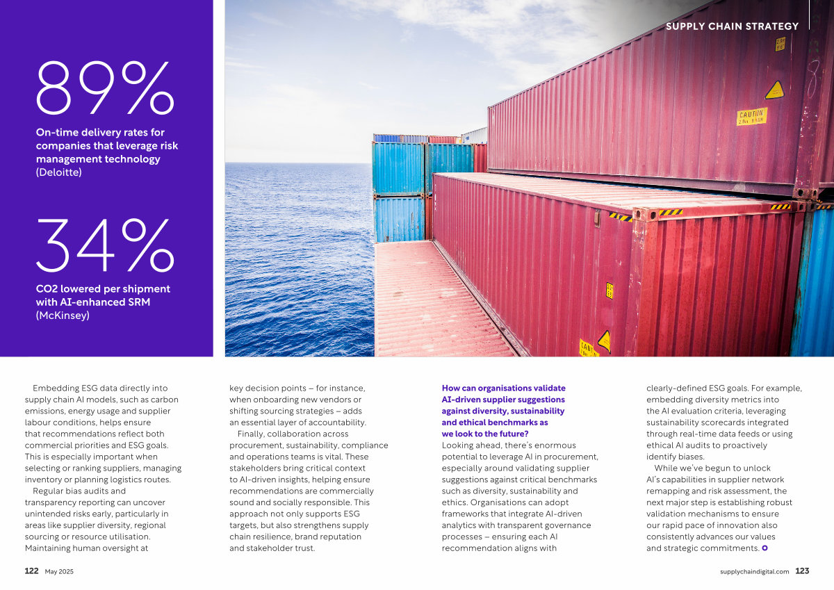 Finally, collaboration across procurement, sustainability, compliance and operations teams is vital. These stakeholders bring critical context to AI-driven insights, helping ensure recommendations are commercially sound and socially responsible. This approach not only supports ESG targets, but also strengthens supply chain resilience, brand reputation and stakeholder trust.
