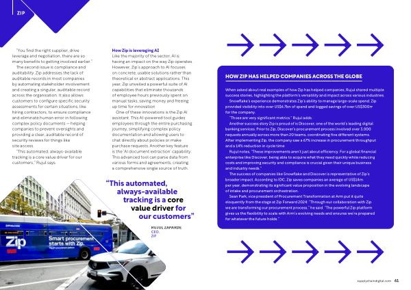 How Zip is leveraging AI Like the majority of the sector , AI is having an impact on the way Zip operates . However , Zip ’ s approach to AI focuses on concrete , usable solutions rather than theoretical or abstract applications . This year , Zip unveiled a powerful suite of AI capabilities that eliminate thousands of employee hours previously spent on manual tasks , saving money and freeing up time for innovation .