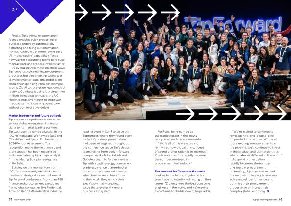 Building on this momentum from IDC , Zip also recently unveiled a bold new brand design at its second annual Zip Forward conference . More than 450 finance and procurement executives from global companies like Prudential , Arm and Reddit attended this industryleading event in San Francisco this September , where they found every inch of Zip ’ s visual presentation had been reimagined throughout the conference space . Zip ’ s design team , hailing from design-forward companies like Nike , Airbnb and Google , sought to further elevate Zip with a cutting-edge , consumergrade experience that embodies the company ’ s core philosophy : when businesses achieve ‘ flow ’ in their work , they unlock their ‘ peak ’ potential — creating value that elevates the entire business ecosystem .
