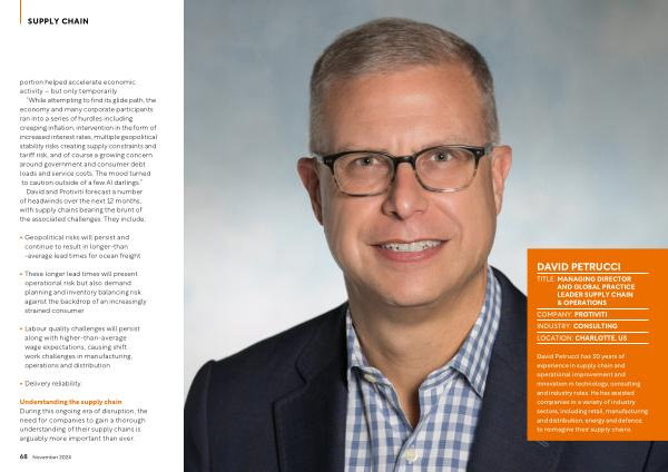 “ While attempting to find its glide path , the economy and many corporate participants ran into a series of hurdles including creeping inflation , intervention in the form of increased interest rates , multiple geopolitical stability risks creating supply constraints and tariff risk , and of course a growing concern around government and consumer debt loads and service costs . The mood turned to caution outside of a few AI darlings .” David and Protiviti forecast a number of headwinds over the next 12 months , with supply chains bearing the brunt of the associated challenges . They include :