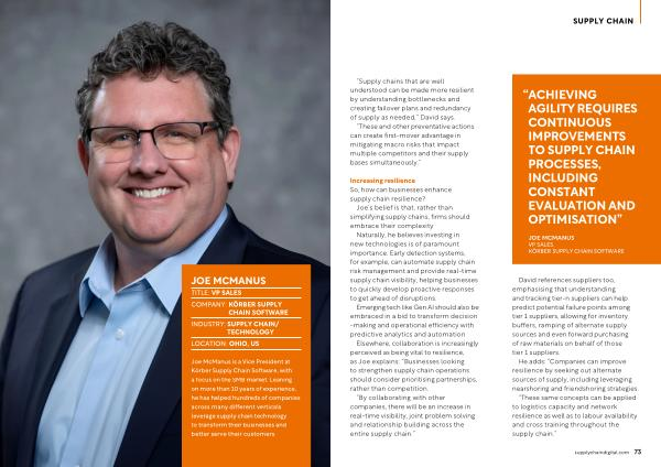 Joe McManus is a Vice President at Körber Supply Chain Software , with a focus on the SMB market . Leaning on more than 10 years of experience , he has helped hundreds of companies across many different verticals leverage supply chain technology to transform their businesses and better serve their customers .