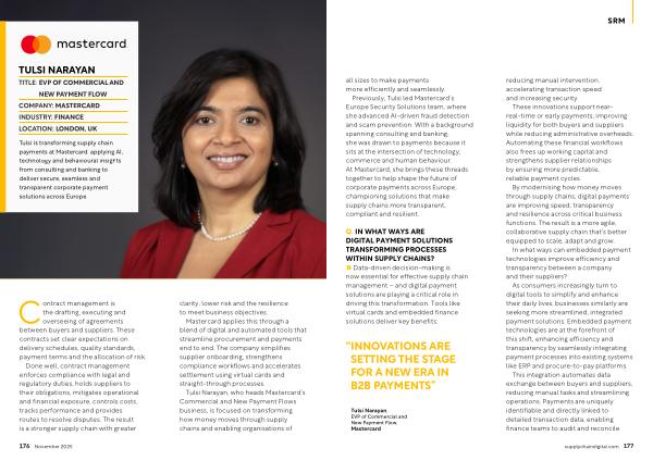Previously, Tulsi led Mastercard’ s Europe Security Solutions team, where she advanced AI-driven fraud detection and scam prevention. With a background spanning consulting and banking, she was drawn to payments because it sits at the intersection of technology, commerce and human behaviour. At Mastercard, she brings these threads together to help shape the future of corporate payments across Europe, championing solutions that make supply chains more transparent, compliant and resilient.