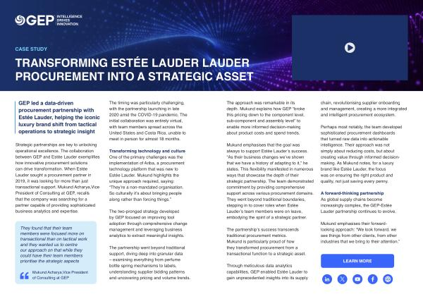 Through meticulous data analytics capabilities, GEP enabled Estée Lauder to gain unprecedented insights into its supply chain, revolutionising supplier onboarding and management, creating a more integrated and intelligent procurement ecosystem.