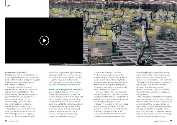 “ A cognitive supply chain goes beyond simply using AI for automation or prediction,” says Stéphane.“ It’ s about creating a self-learning, adaptive system that continuously improves by interpreting data in context, understanding cause and effect and making recommendations, or even decisions, in real time.”