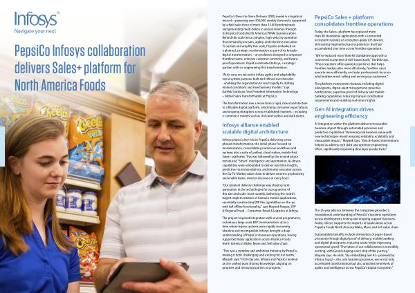 PepsiCo’ s Direct-to-Store Delivery( DSD) model is a logistical marvel— powering over 500,000 weekly store visits supported by a field sales force of more than 25,000 professionals and generating multi-billion in annual revenue through its PepsiCo Foods North America( PFNA) business alone. Behind this scale lies a complex, high-velocity operation that demands precision, agility, and relentless execution. To sustain and amplify this scale, PepsiCo embarked on a planned, strategic modernization as part of its broader digital transformation— an evolution designed to empower frontline teams, enhance customer-centricity, and futureproof operations. PepsiCo entrusted Infosys, a strategic partner with co-engineering this transformation.