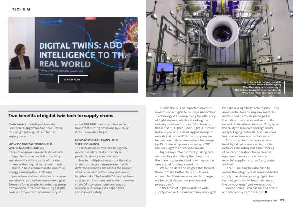 “ Sustainability is an important driver of investment in digital twins ,” says Annecchino , “ Technology is also improving the efficiency of flight engines , which is shrinking the industry ’ s carbon footprint .” Confirming this is Stuart Hughes , Chief Digital Officer at Rolls-Royce , who in the Capgemini report reveals that , since 2014 , the company has helped one of its airlines reduce fuel usage by 85 million kilograms – a saving of 200 million kilograms of carbon dioxide
