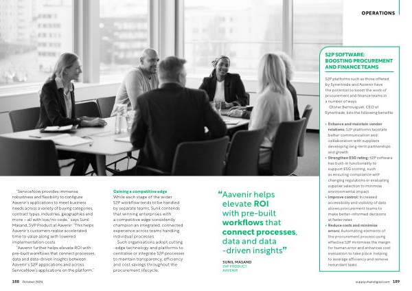 “ Aavenir further helps elevate ROI with pre-built workflows that connect processes , data and data-driven insights between Aavenir ’ s S2P applications and across ServiceNow ’ s applications on the platform .”