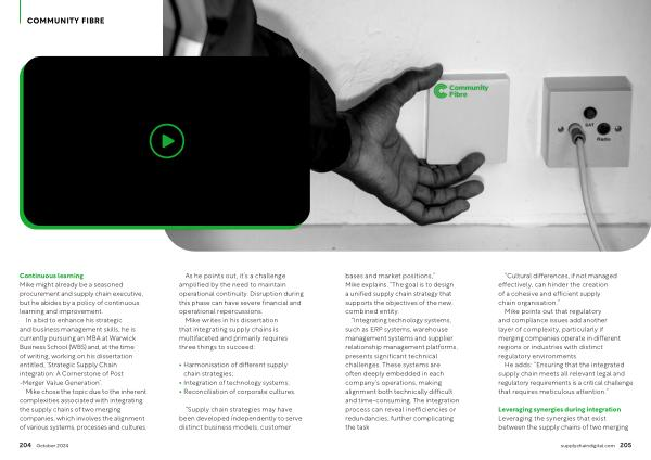 Mike chose the topic due to the inherent complexities associated with integrating the supply chains of two merging companies , which involves the alignment of various systems , processes and cultures .