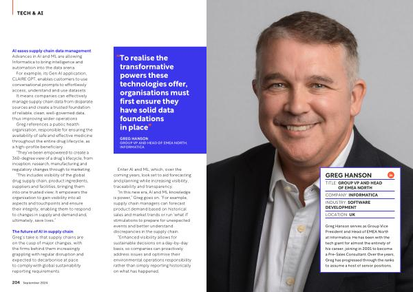 Greg Hanson serves as Group Vice President and Head of EMEA North at Informatica . He has been with the tech giant for almost the entirety of his career , joining in 2001 to become a Pre-Sales Consultant . Over the years , Greg has progressed through the ranks to assume a host of senior positions .