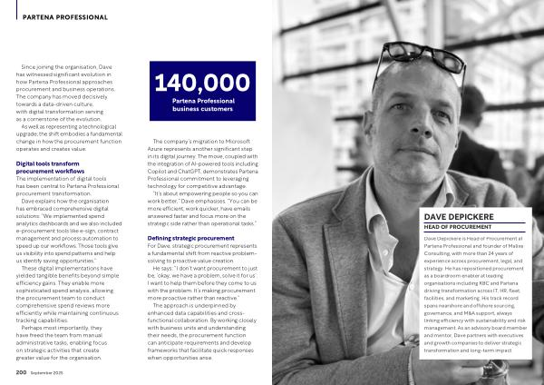 Dave Depickere is Head of Procurement at Partena Professional and founder of Malixe Consulting, with more than 24 years of experience across procurement, legal, and strategy. He has repositioned procurement as a boardroom enabler at leading organisations including KBC and Partena, driving transformation across IT, HR, fleet, facilities, and marketing. His track record spans nearshore and offshore sourcing, governance, and M & A support, always linking efficiency with sustainability and risk management. As an advisory board member and mentor, Dave partners with executives and growth companies to deliver strategic transformation and long-term impact.