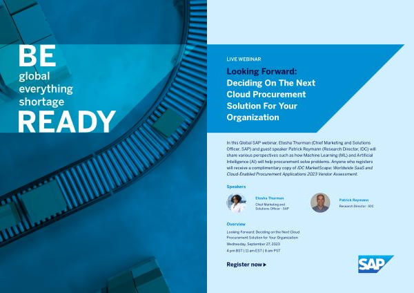 In this Global SAP webinar, Etosha Thurman( Chief Marketing and Solutions Officer, SAP) and guest speaker Patrick Reymann( Research Director, IDC) will share various perspectives such as how Machine Learning( ML) and Artificial Intelligence( AI) will help procurement solve problems. Anyone who registers will receive a complimentary copy of IDC MarketScape: Worldwide SaaS and Cloud-Enabled Procurement Applications 2023 Vendor Assessment.