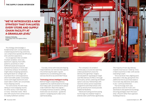 Technology drives intelligent routing Behind Target’ s expanding delivery capabilities lies sophisticated technology that makes split-second decisions about order fulfilment. Real-time signals – including inventory locations, staffing levels and cost structures – guide the system in assigning each order to the optimal building.