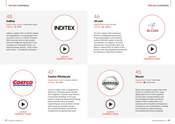 JD. com’ s supply chain impresses thanks to widespread automation, AI-powered logistics and industryleading fulfilment speed, driven by its subsidiary JD Logistics. Its smart warehouses, cross-border reach and ability to deliver 90 % of orders on the same or next day set global benchmarks for efficiency, scale and innovation. WATCH COMPANY VIDEO