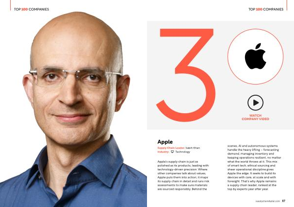 polished as its products, leading with technology-driven precision. Where other companies talk about values, Apple puts them into action; it maps its supply chain in detail and runs risk assessments to make sure materials are sourced responsibly. Behind the scenes, AI and autonomous systems handle the heavy lifting – forecasting demand, managing inventory and keeping operations resilient, no matter what the world throws at it. This mix of smart tech, ethical sourcing and sheer operational discipline gives Apple the edge. It seeks to build its devices with care, at scale and with foresight. That’ s why Apple remains a supply chain leader, ranked at the top by experts year after year.