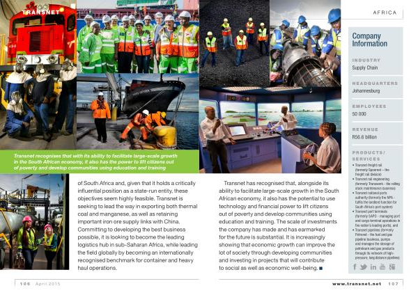 of South Africa and , given that it holds a critically influential position as a state-run entity , these objectives seem highly feasible . Transnet is seeking to lead the way in exporting both thermal coal and manganese , as well as retaining important iron ore supply links with China . Committing to developing the best business possible , it is looking to become the leading logistics hub in sub-Saharan Africa , while leading the field globally by becoming an internationally recognised benchmark for container and heavy haul operations .